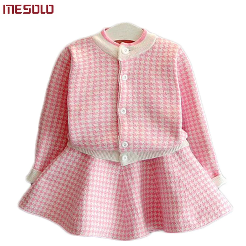 Best Price Girls Clothing Sets Kids Houndstooth Knitted Suits Long Sleeve Plaid Jackets+Skirts 2Pcs for Kids Suits